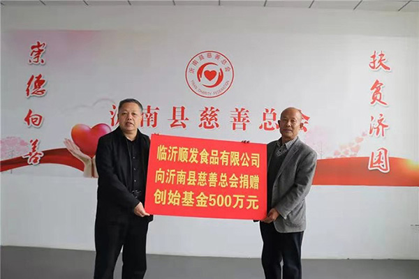 2020年11月23日,縣慈善總會舉行創始基金捐贈儀式,臨沂順發食品有限公司將“留本付息”式創始基金由300萬元提高到500萬元,縣慈善總會會長劉振奎、副會長高善群、秘書長趙遵信,縣慈善總會理事、臨沂順發食品有限公司總經理高則富,縣慈善總會財務基金部部長任德獻參加捐贈儀式。