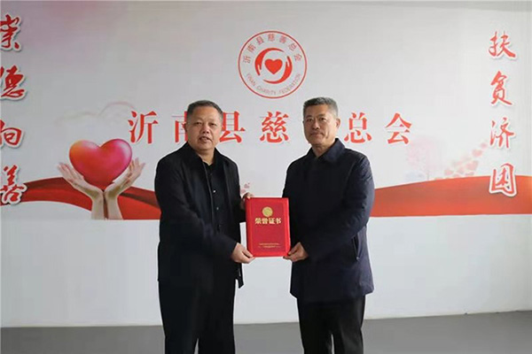 沂南縣慈善總會會長劉振奎向順發食品頒發捐贈證書